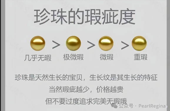 瑕疵程度分为:几乎无瑕>极微瑕>微瑕>重瑕,珠光相同的情况下,尽量挑选微瑕以上。在正常社交距离中,这些瑕疵是看不出来的。