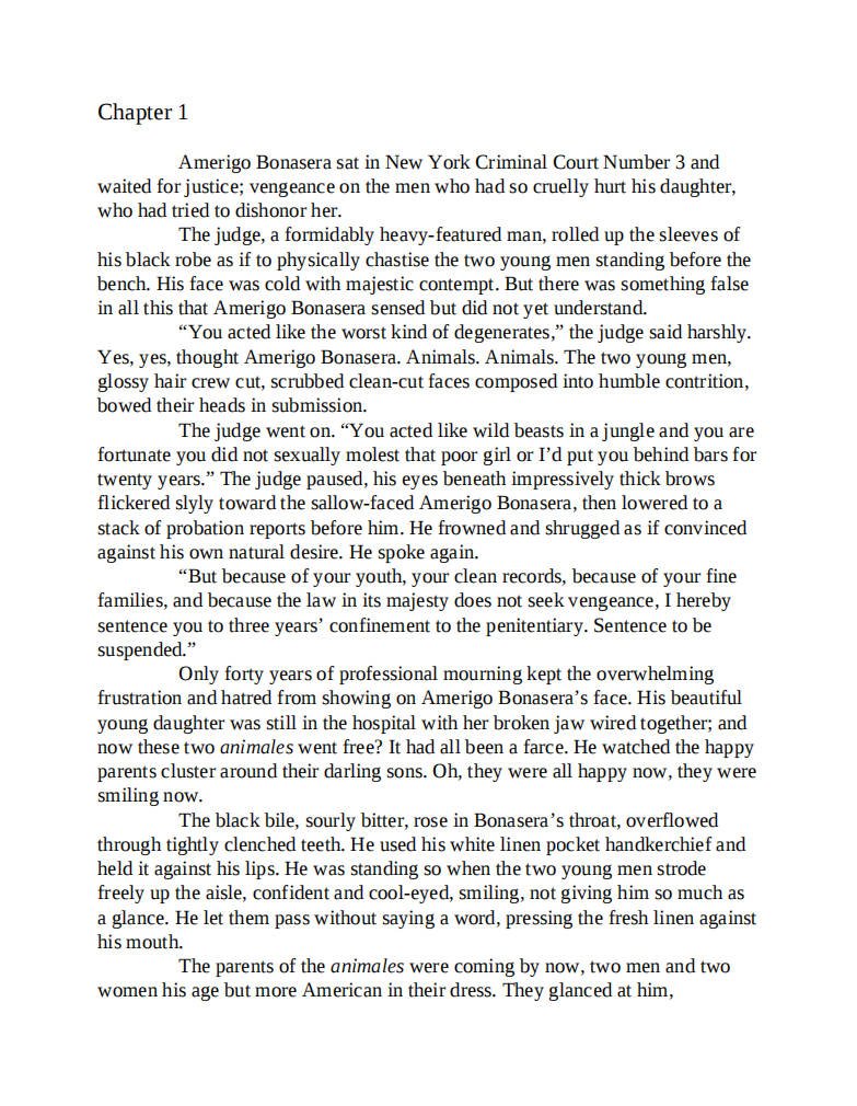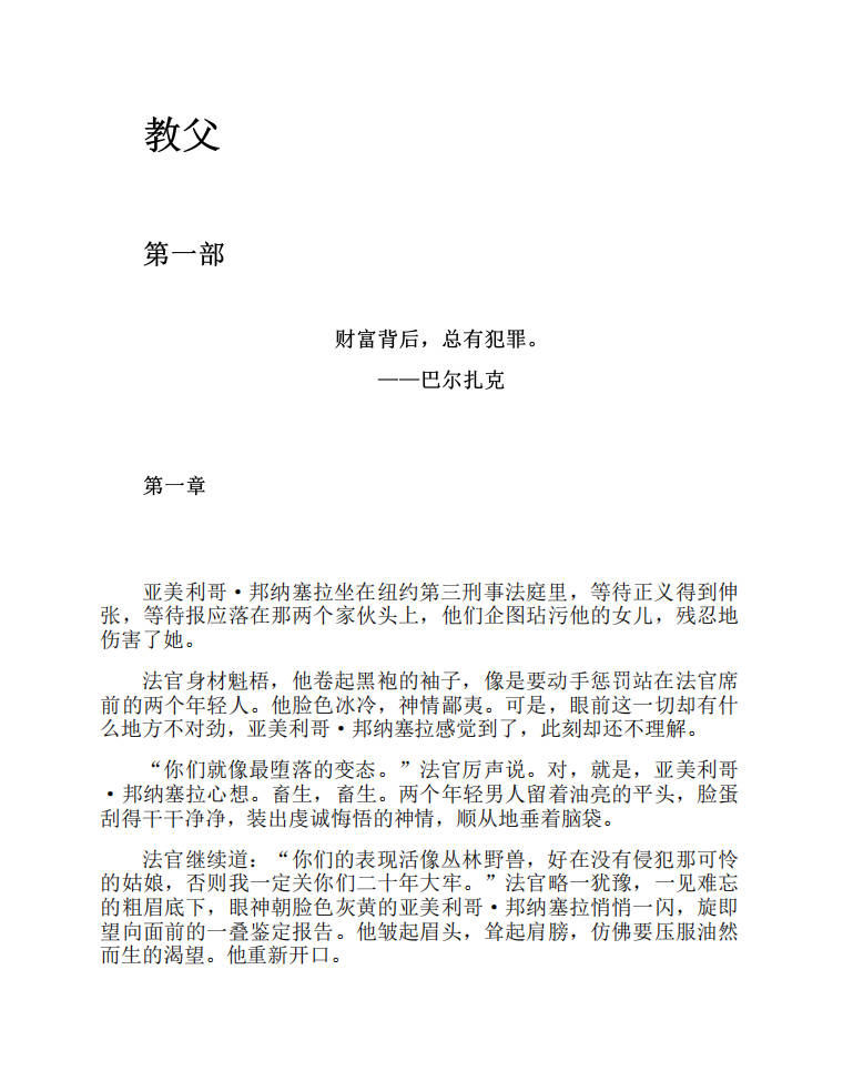 该小说主要描写了1945年至1955年之间,意大利移民科利奥尼家族在困境中的挣扎和生存之道,科利奥尼家族是五大黑帮势力集团之一,为了能够生存不惜进行各种残忍的攻略,用枪、用斧头、用刑具,最后在斗争激烈的环境下生存了下来,实现了对美国黑帮势力的统一。