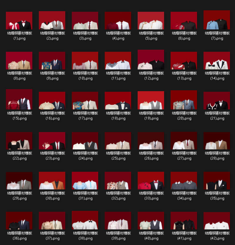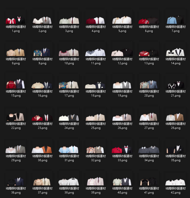 50套结婚照免抠PNG素材。没有头部,只有衣服上身部分。