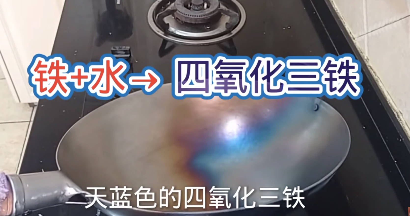 高温作用下,铁锅氧化生成四氧化三铁保护膜。这层保护膜怕酸。自然冷却。