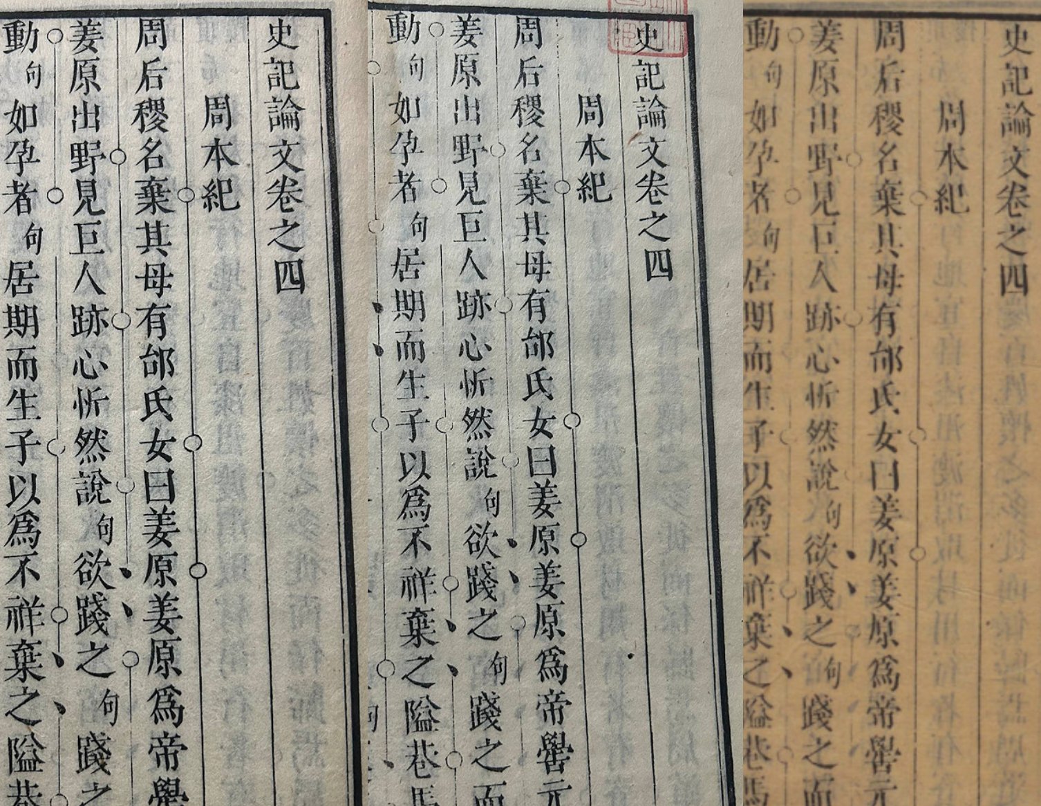 从字形上来看,三个版本均是出自同一个刻板。某个字的笔画特点,字形,歪的角度方像,就可以看出一二。比如第二行周本纪的周字,三个版本几乎一模一样。我不清楚为何里面是日字,而第三行第一字的周字里面却是口字。里面的口字也是微微偏左。