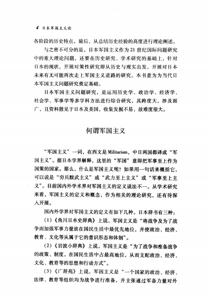 1945年日本战败投降,日本军国主义的内外政策彻底破产。日本军国主义给邻国人民带来了深重的灾难,为向邻国人民表示反省的诚意,为警示日本今后的发展道路,日本理应对军国主义进行严肃、认真、深刻地研究和批判。日本战败投降已阅一甲子,但令人遗憾的是,在20世纪50至70年代,日本国内除少数进步学者提出了一些研究成果外,从总体上看对军国主义的研究与批判十分缺乏。近年在日本虽出版了极少量关于日本军国主义的研究著作,但多是欧美学者的译作。对日本学者而言,甚至已发展到连“军国主义”、“法西斯”、“侵略”一类词语的使用都成为禁区的地步,更不用说对军国主义、法西斯、侵略战争进行批判,是如何被视为大逆不道,要遭到右翼势力的无端攻击,其人身安全难有保障了。显而易见,今后仍难期待日本的军国主义问题专题研究得到突破性进展。