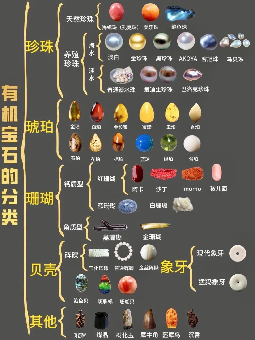 有机宝石是指其形成与生命体(动物、植物)有关联,其矿物成分中含有有机成分(CHO化合物)的宝石。常见的有珍珠、琥珀、珊瑚、贝壳、象牙