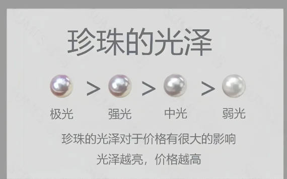 珍珠的光泽主要分为:极光、强光、中光、弱光。珍珠光泽对价格影响很大,光泽越亮的珍珠价格越高哦。