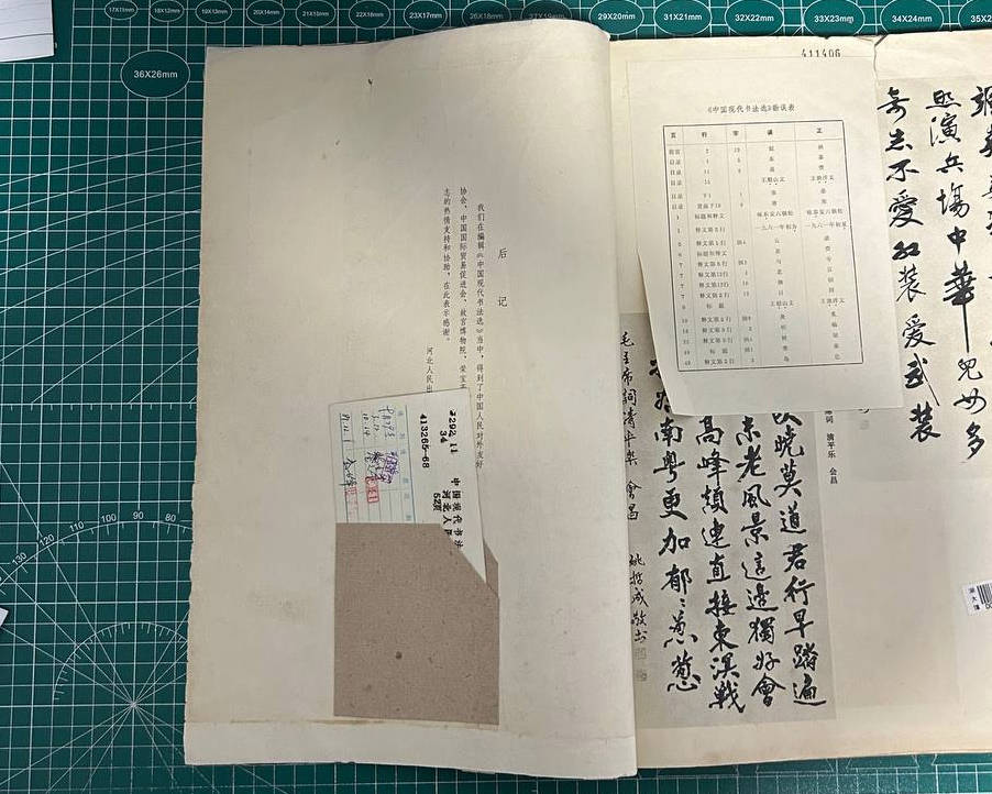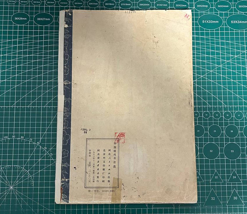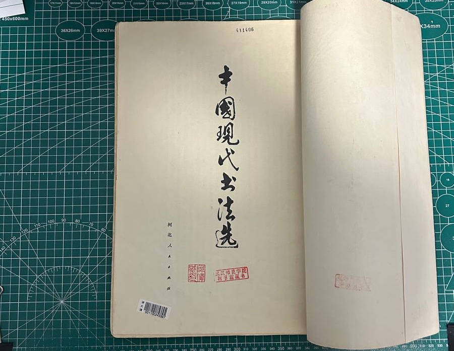 这是一本书法类书籍。馆藏书籍。内容是中国近代名家书法。封面有破损。书背有修补的痕迹。扉页有印戳:武汉师范学院图书馆藏书。书最后有借书卡。共有四条借出记录,最新的一条时间是1981年12月。