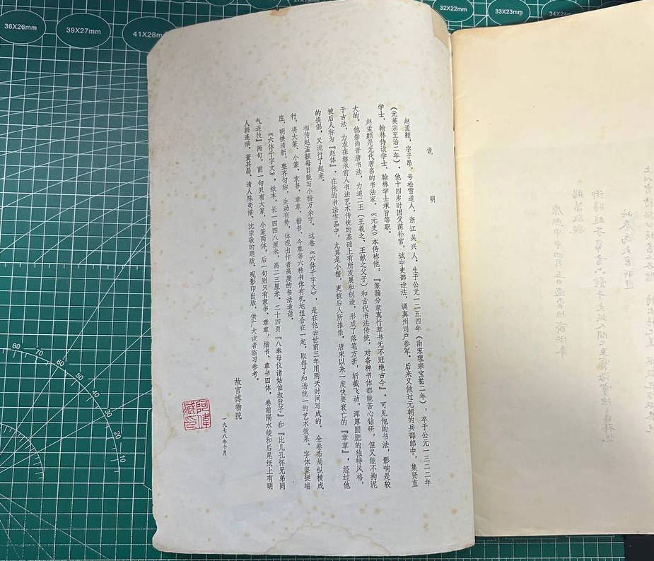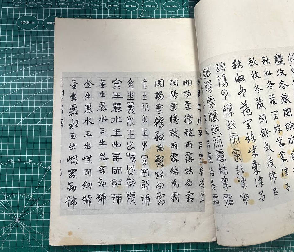 这是一本书法类书籍。馆藏书籍。内容是赵孟頫千字文,六种字体,。书背有修补的痕迹。扉页有印戳:武汉师范学院图书馆藏书。