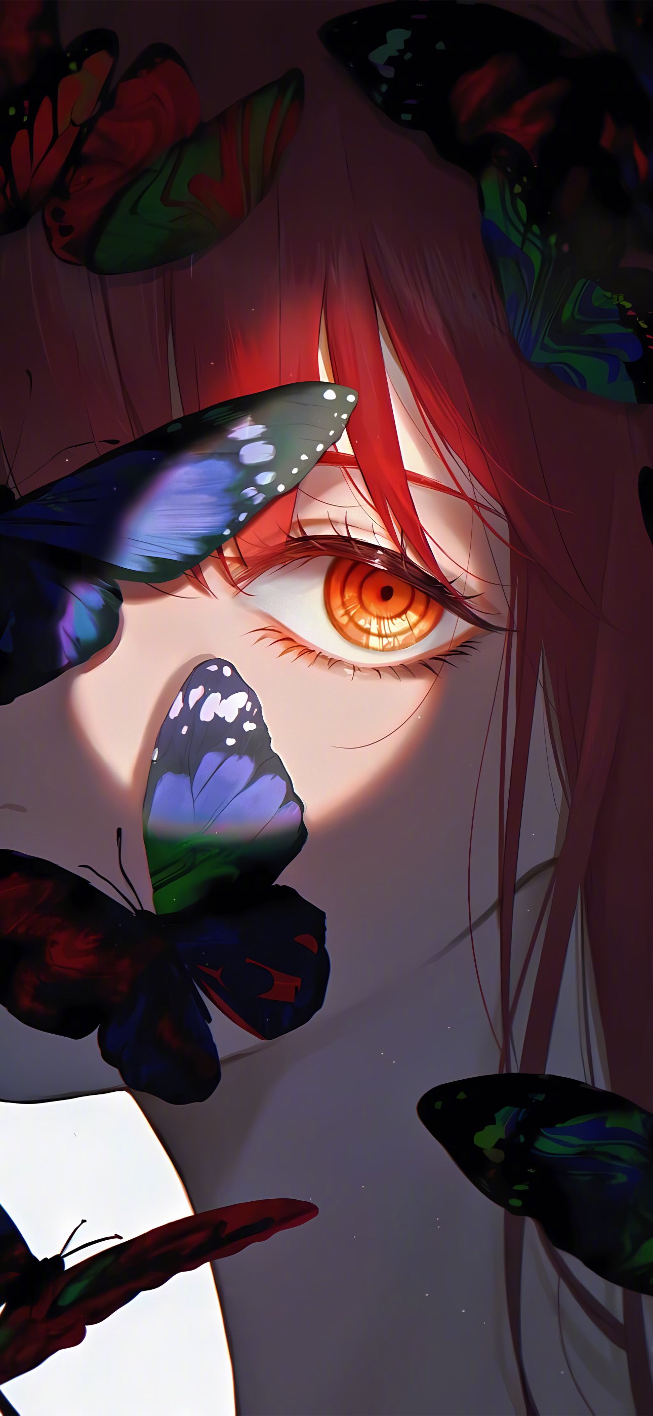 壁纸;手机壁纸;女孩子;长发;红发;蝴蝶;电锯人;玛奇玛;