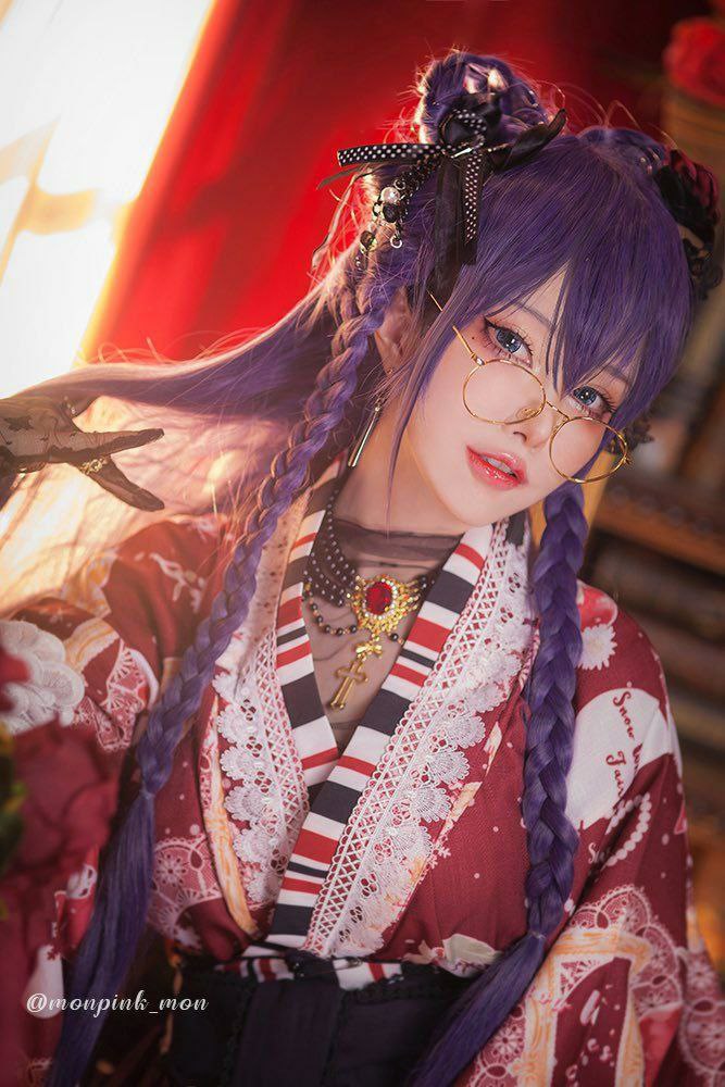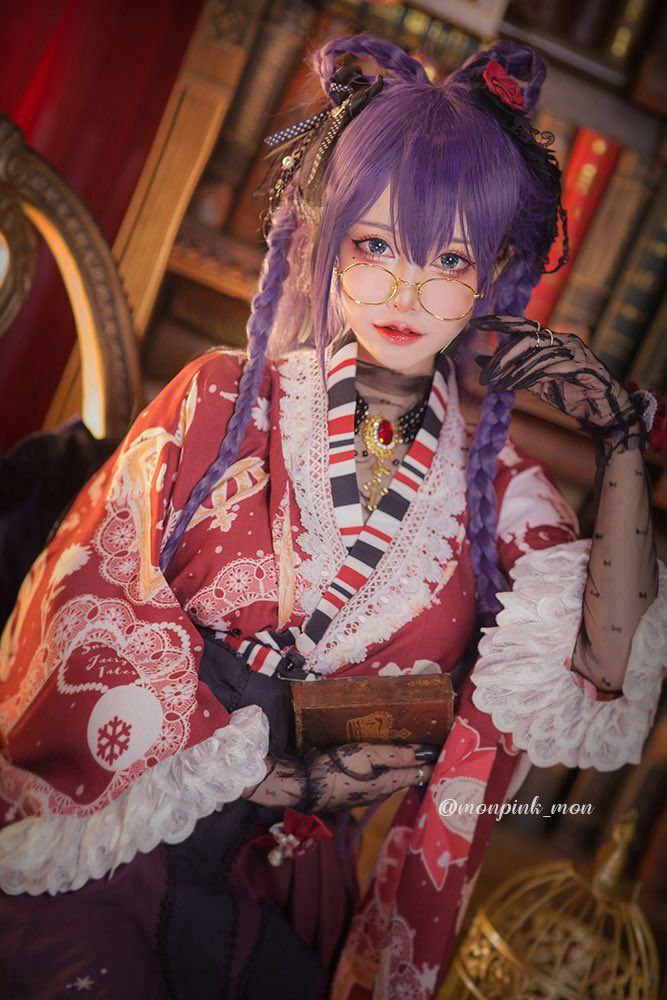 Cosplay;女孩子;紫发;眼镜;黑丝;书;