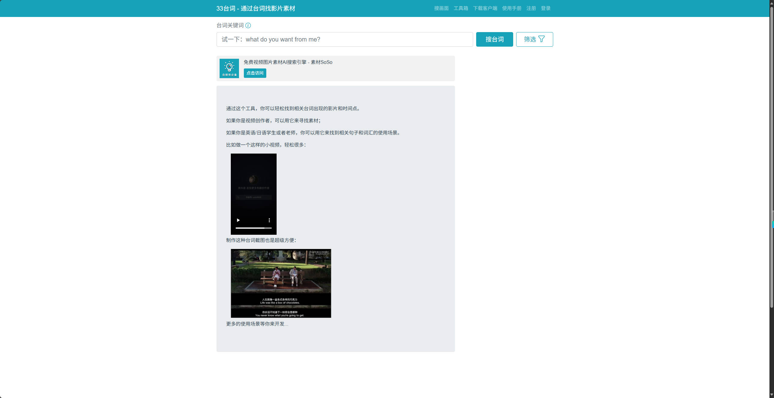 一个好用的电影字幕搜索引擎,轻松搜索台词出现的影片和时间点,是视频创作者的必备工具,是帮助英语学习的利器。
