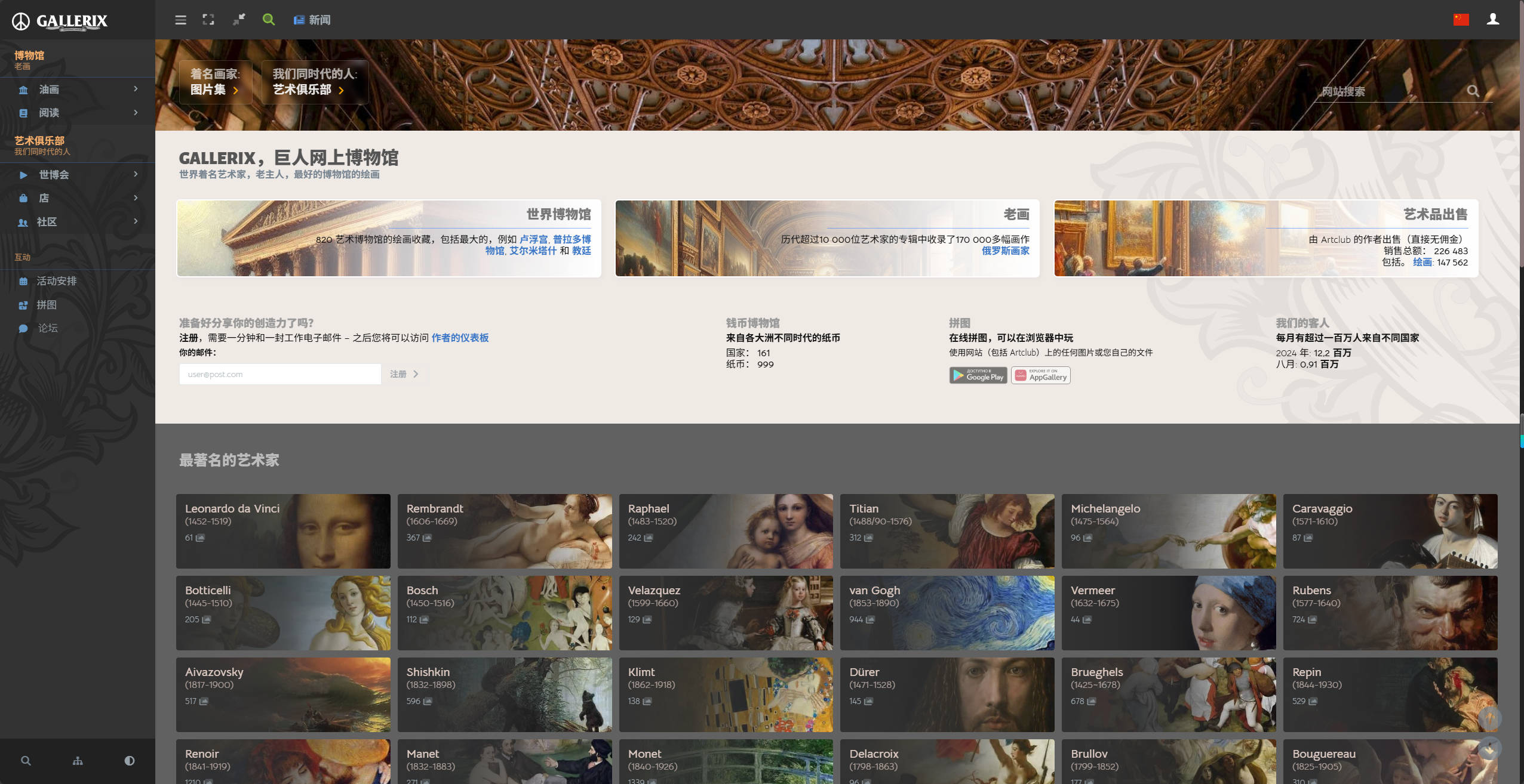 ★ RuNet最大和最受欢迎的关于绘画的专题网站。 超过4万名艺术家,从我们同时代的人到已经熟知的老主人。 来自私人收藏和世界上最好的博物馆的50多万幅画作。 巨型虚拟博物馆Gallerix全天开放,无需休息,入场免费,欢迎您光临!