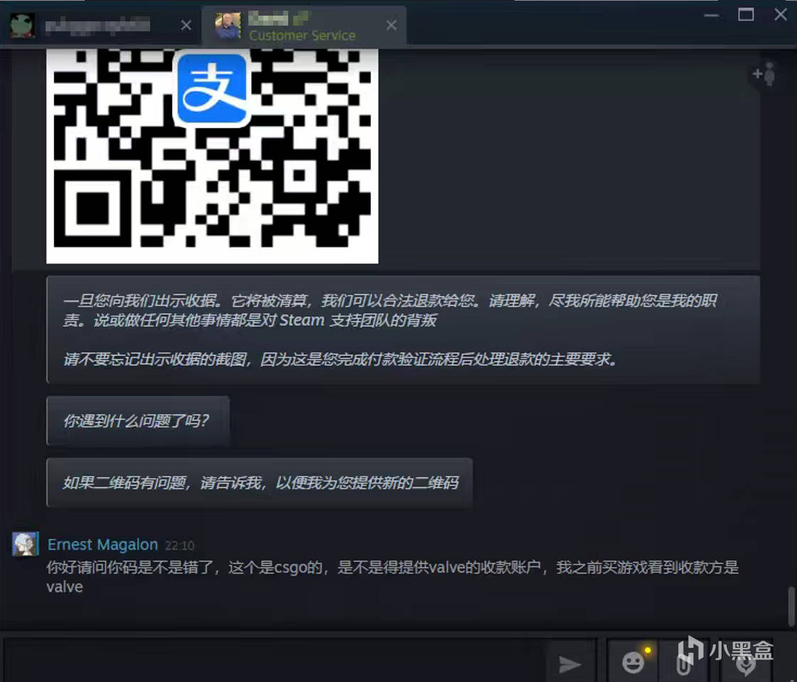 4,客服一顿忽悠后让你扫码付款(声称验证完退回),实际骗子给的二维码是买cs饰品的付款码。