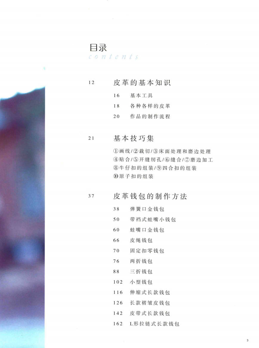 看上去稍微有些复杂的皮钱包,可能会因为具有一定的制作难度而吓倒一些人。它需要专用工具以及技巧。然而,皮革并不需要像布料那样折双层加工,它本身就有一定的厚度,不加内衬也能使用。事实上,皮革是创作处理上较为简单的素材。本书汇集了一些不需要使用缝纫机和复杂处理技术的作品,即便是初学者也能够轻松掌握。希望你能够通过手工制作,领略到皮钱包的魅力:能长期使用,其颜色也会随时间的流逝而渐变。