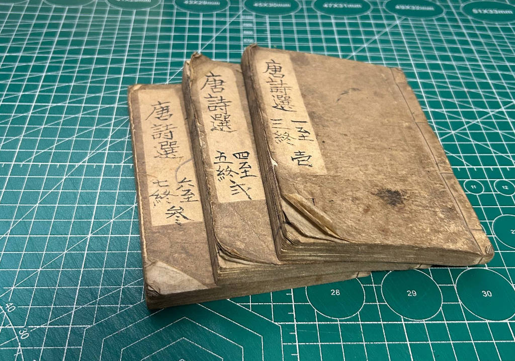 这是一本和刻本(或手抄本),古籍,汉字,繁体,线装。一共三本七卷全。封面内页有很多字迹,毛笔铅笔等。时间有两处。拥有者签名至少三处。黑色的印章不知是什么符号。