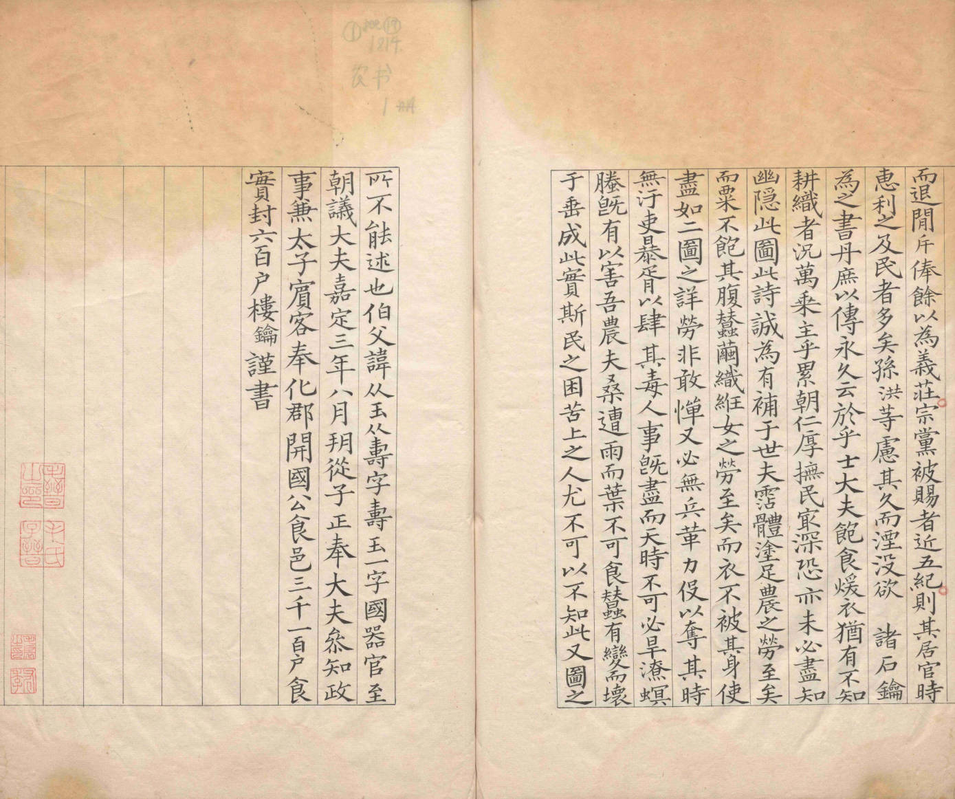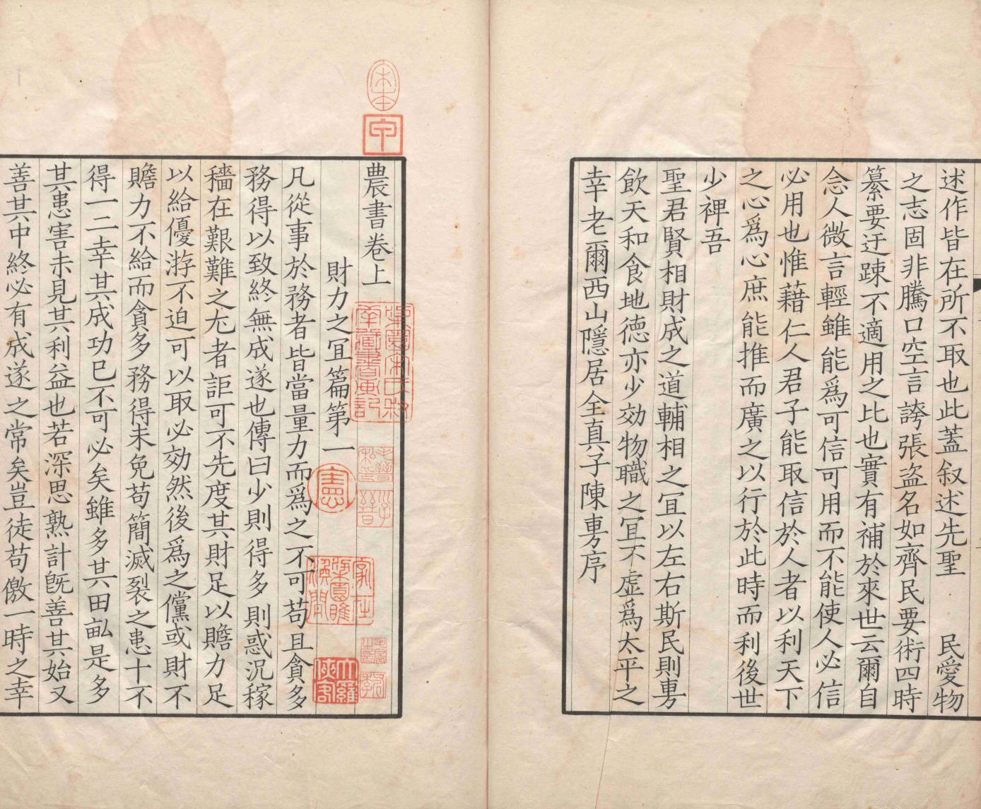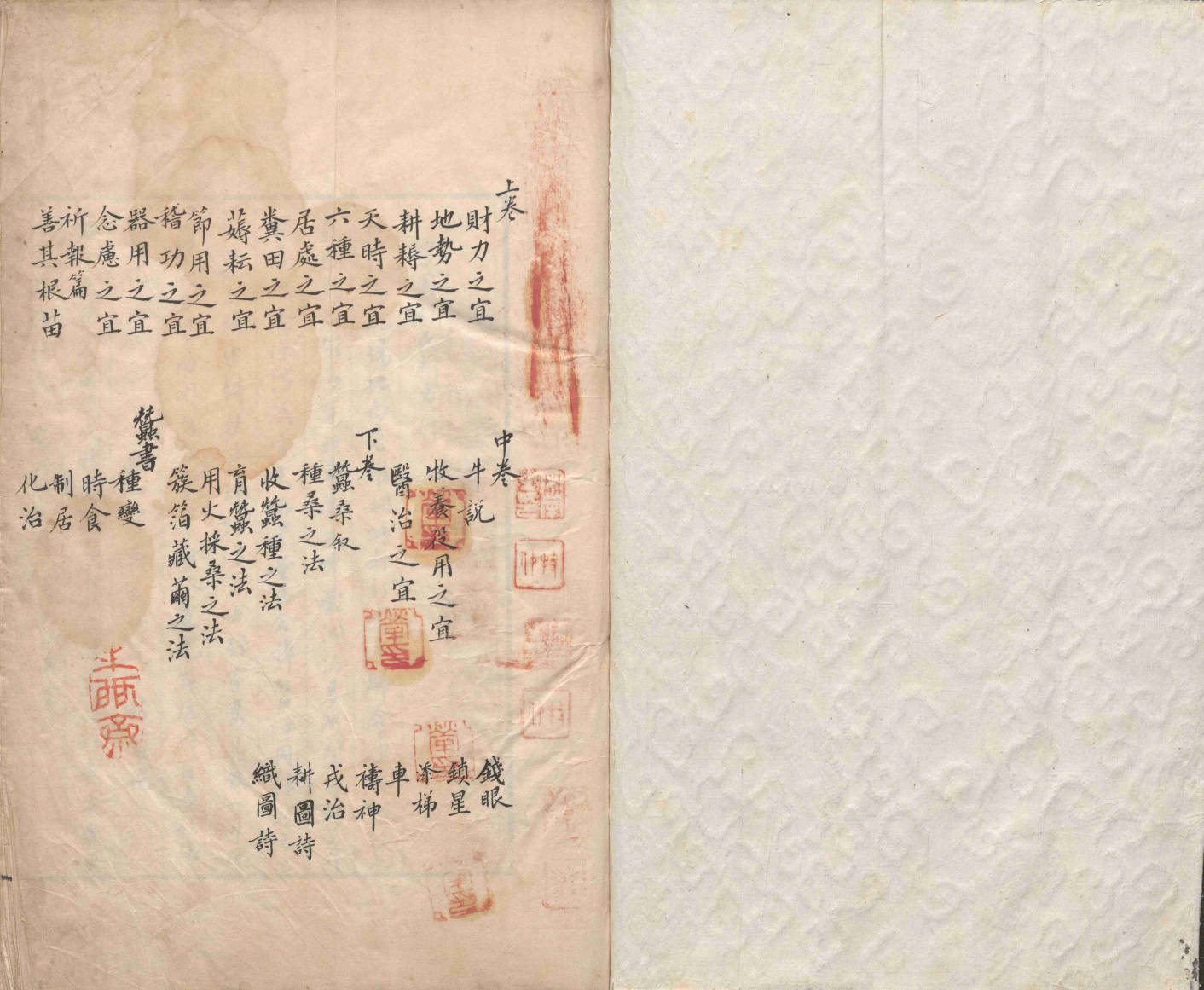 此《农书》由南宋陈旉编撰。全书分上中下三卷,上卷总论土壤耕作和作物栽培,中卷讲述耕畜的饲养管理,下卷讲述有关种桑养蚕的技术。后附:秦观《蚕书》、楼璹《於潜令楼公进耕织二图诗》。此为明末毛氏汲古阁影宋抄本,行款格式与宋版刻本相同,抄写精美。
