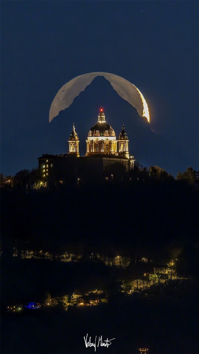 照片的前景是苏佩尔加大教堂,中间是维佐峰(Monviso),而月球则不偏不倚,恰巧位于二者的正后方。尽管这是一轮新月,但曝光时间足以让地照照亮的月球暗面也显现出来。