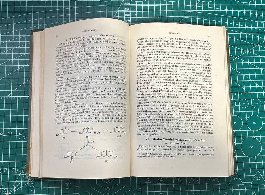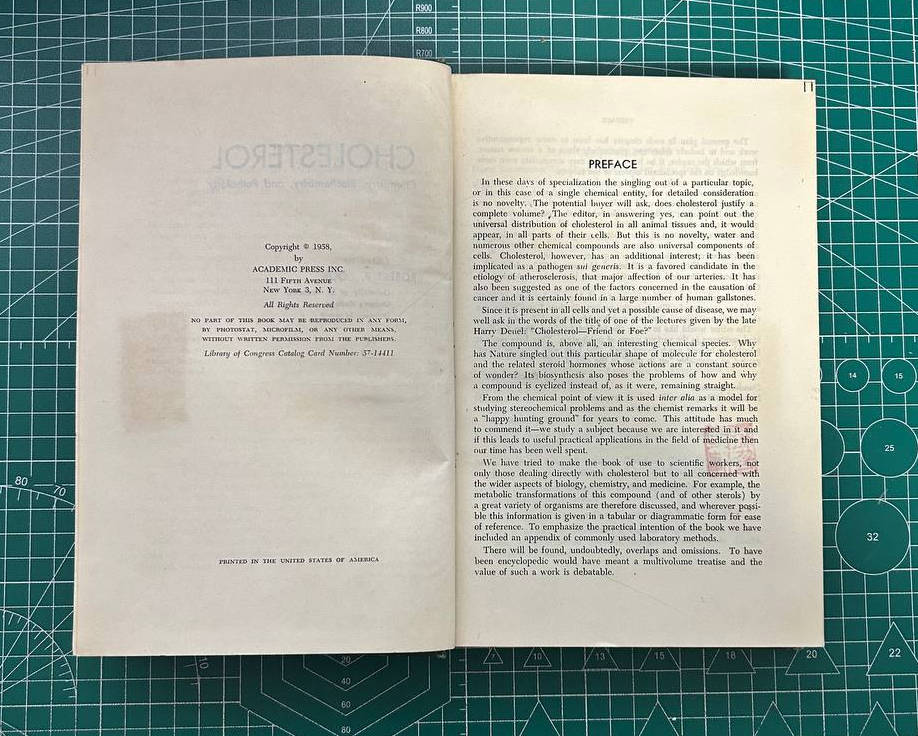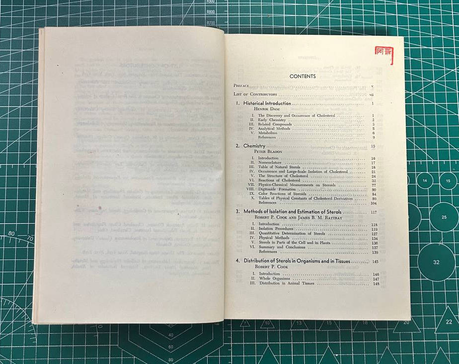 这是一本化学类书籍。英文。硬皮精装。内容是和胆固醇相关的内容。很学术。扉页有原主人签字:六一年于乌校生化室-XXX法(原主人名)。