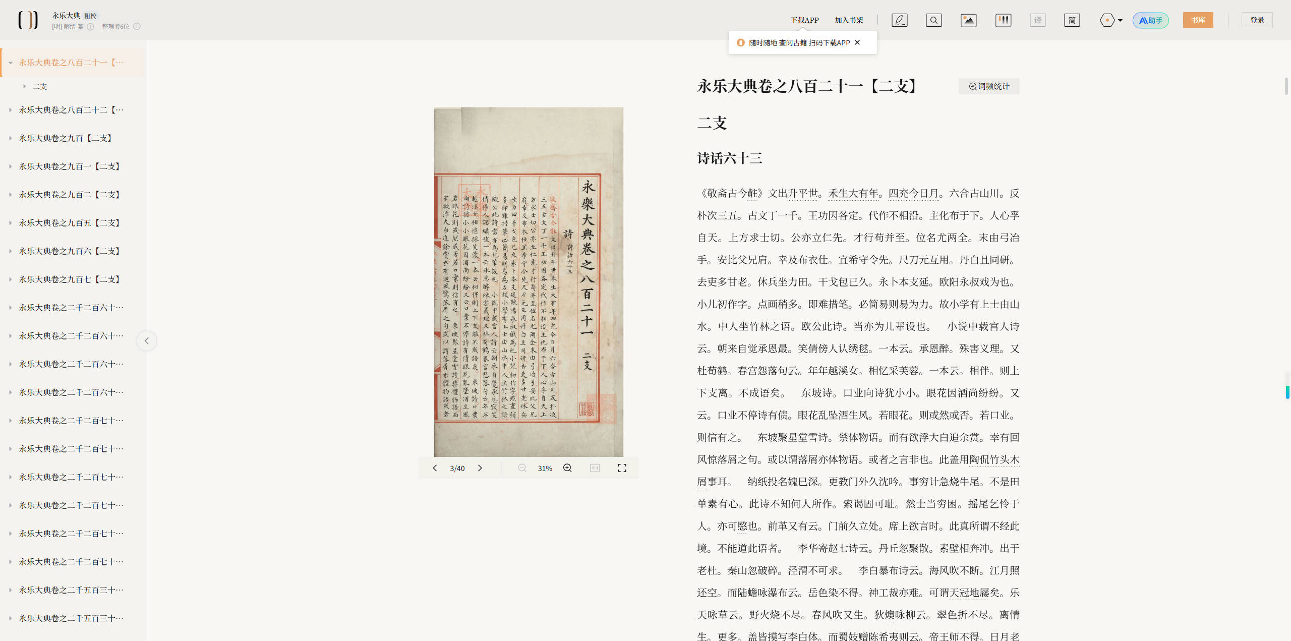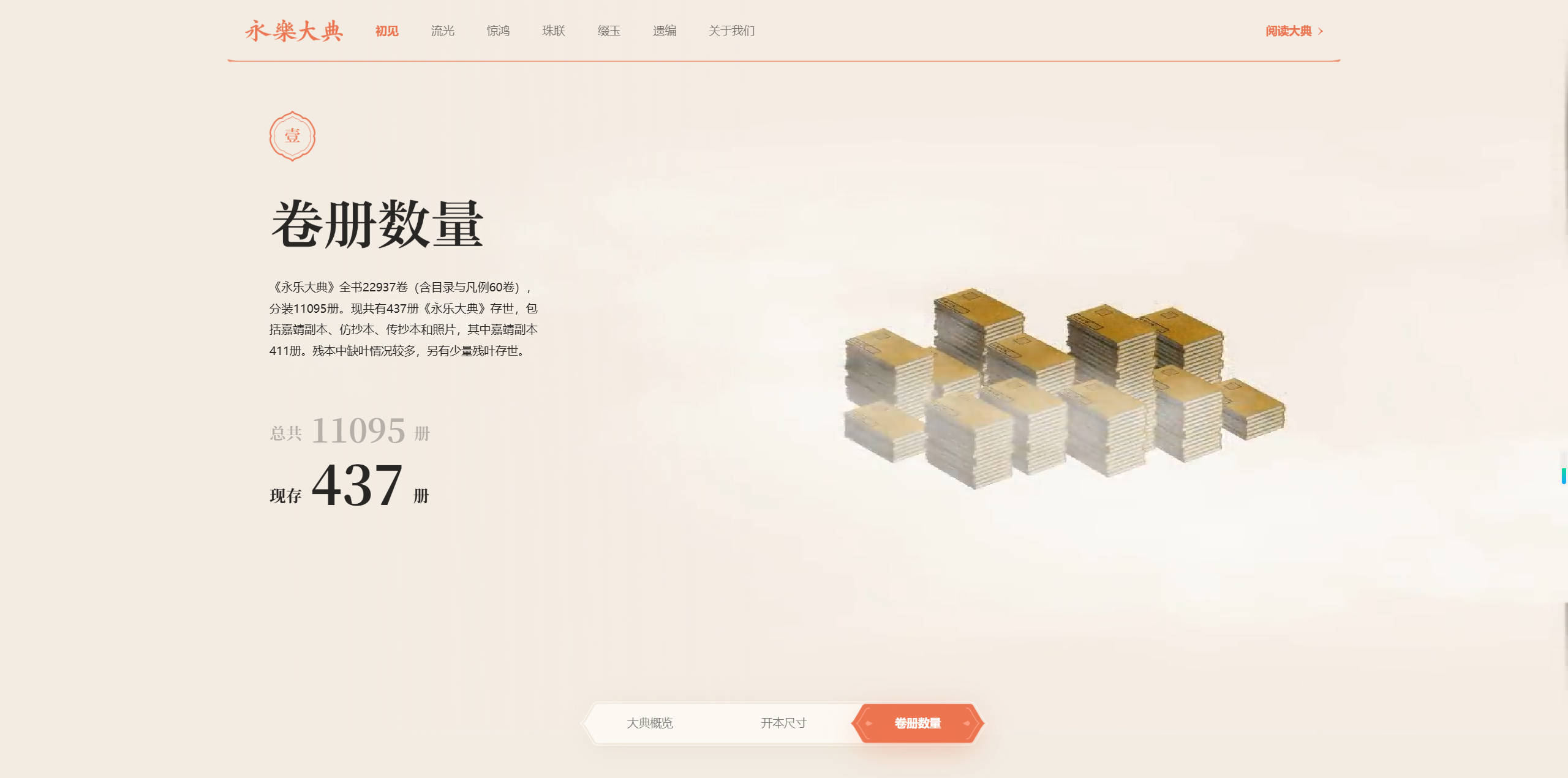 《永乐大典》编纂于明朝永乐年间,全书 22877 卷,分装 11095 册,共约 3.7 亿字,大量保存了中国 14 世纪以前的文学、艺术、史地、哲学和应用科学等方面资料,被誉为“世界有史以来最大的百科全书”。历经六百年,《永乐大典》仅存 400 余册残本,散落在 8 个国家和地区。