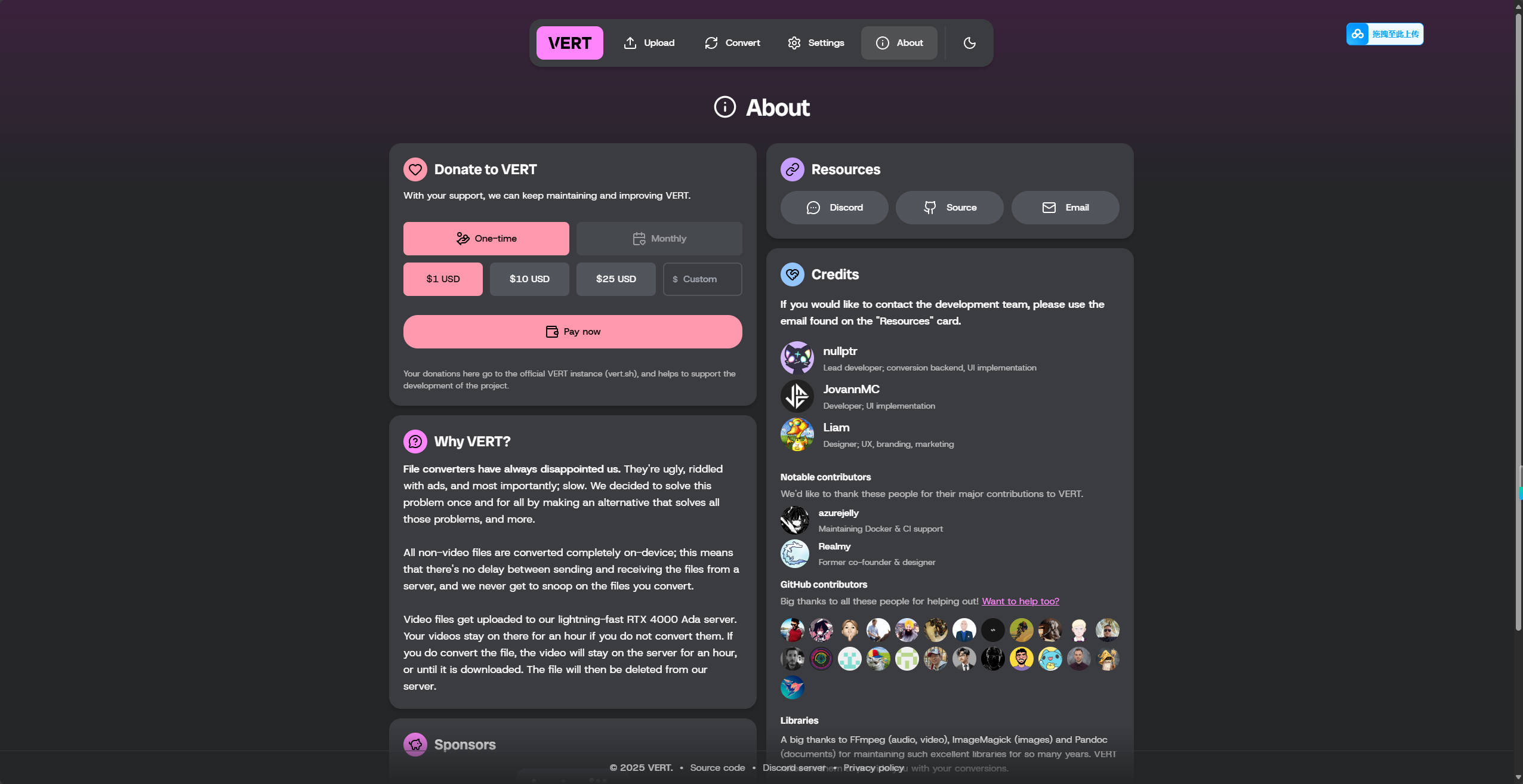 使用 VERT,您可以快速转换任意格式的图片、视频、音频及文档文件。无广告、无追踪、开源免费,且除视频外的所有处理均在您的设备本地完成。