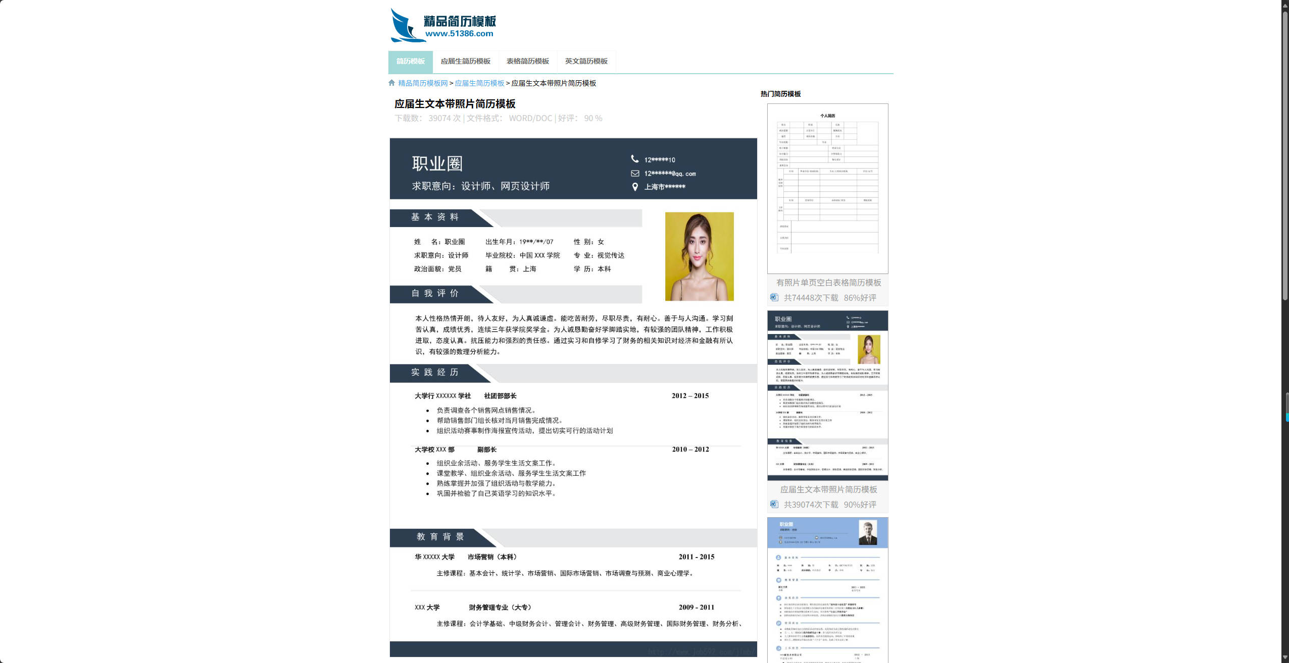 为您挑选各种优质简历模板,WORD格式可编辑,免费下载,你一定能够在这里找到合适您的简历模板:通用简历模板,应届生简历,简历表格,简历封面,英文简历,简历范文。直接下载即可使用。