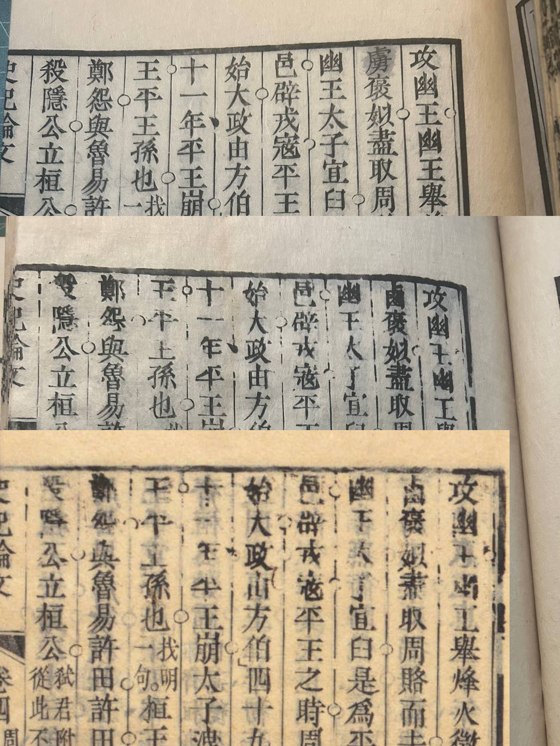 从字形上来看,三个版本均是出自同一个刻板。某个字的笔画特点,字形,歪的角度方像,就可以看出一二。比如第二行周本纪的周字,三个版本几乎一模一样。我不清楚为何里面是日字,而第三行第一字的周字里面却是口字。里面的口字也是微微偏左。
