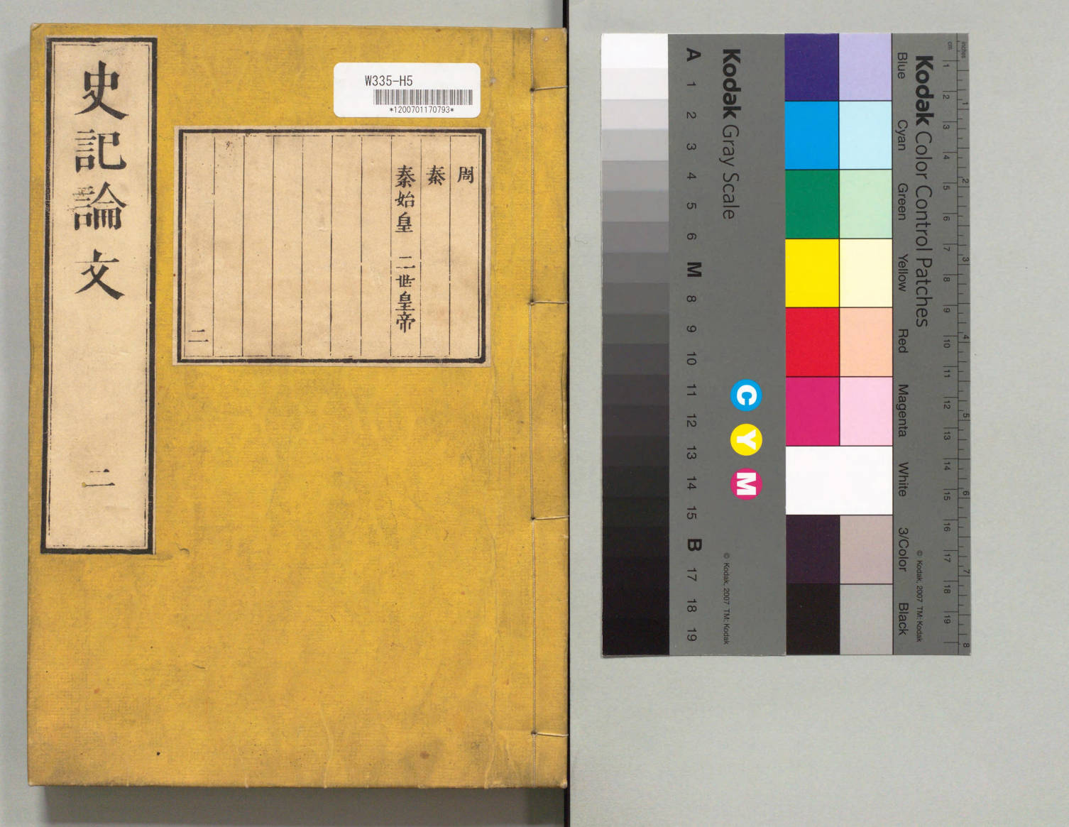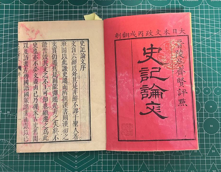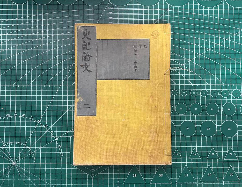 《史记论文》最早的版本就是康熙二十五年(1686)广州吴氏尺木堂刊本,中国国家图书馆藏有藏。将近100年以后,尺木堂重新刊刻《史记论文》,武汉大学图书馆藏有乾隆四十五年(1780)刻本。又过了将近半个世纪,《史记论文》漂洋过海,在日本的刊行。日本天游园以康熙二十五年广州尺木堂原刊本为底本翻刻《史记论文》。日本翻刻中国古籍,大多粗制滥造。但天游园的这部《史记论文》堪称精品。书的开本阔大,包装非常考究,封面的签条,用的是洒金纸,在光线之下熠熠生辉。每册的书签有两条,竖着的是书名《史记论文》和册数,横着的是本册内容的目录,这是沿用清初刻书的习惯。书的封皮,用的是厚实的专用皮纸,防水性和耐磨性非常好。书的内页,是上好的皮纸,纸色稍黄,柔软细致,正面光滑,背面略涩,与美浓纸相似。刻工则全仿康熙风格,保留着晚明刻书的韵味。其中,又以书前的吴兴祚《史记论文序》最佳,下刀均匀,瘦劲工致,每半页仅刻七行,每行仅刻十六字,开卷赏心悦目。即使是当时的中国刻工,也未必能刻出这样精美的方体大字来。一转眼,文政本《史记论文》问世也有182年了。近两个世纪以来,这部书保存得非常完好,期间经历了怎样的风风雨雨,又如何躲过一场又一场的战乱,重新回到它的作者吴见思的故乡,大概永远是个谜了。