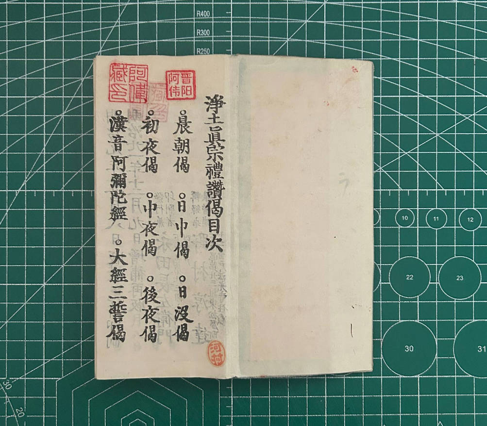这是一本和刻本,古籍,宣纸,经折本。汉字,日文标注。佛教类书籍。全称《净土真宗礼赞偈汉音阿弥陀经大经三誓偈入付御代文》。